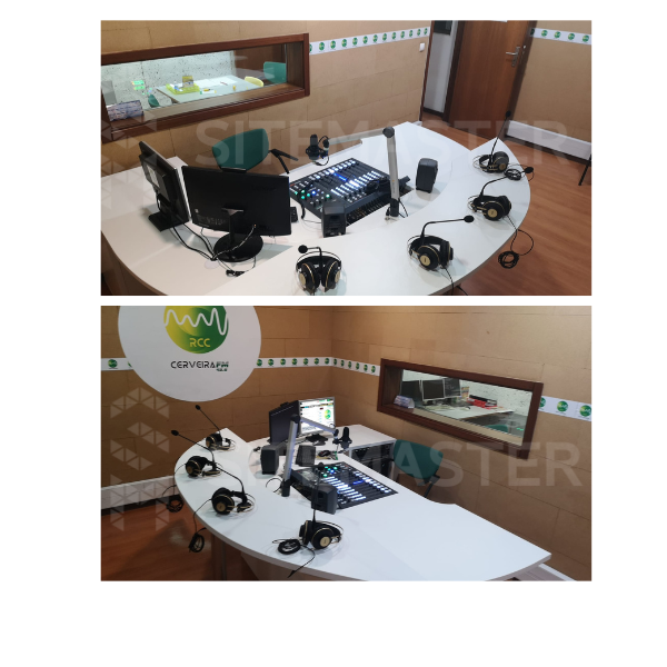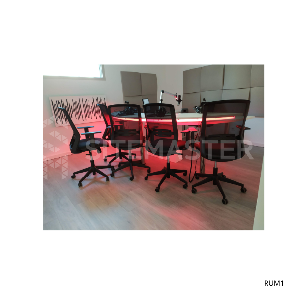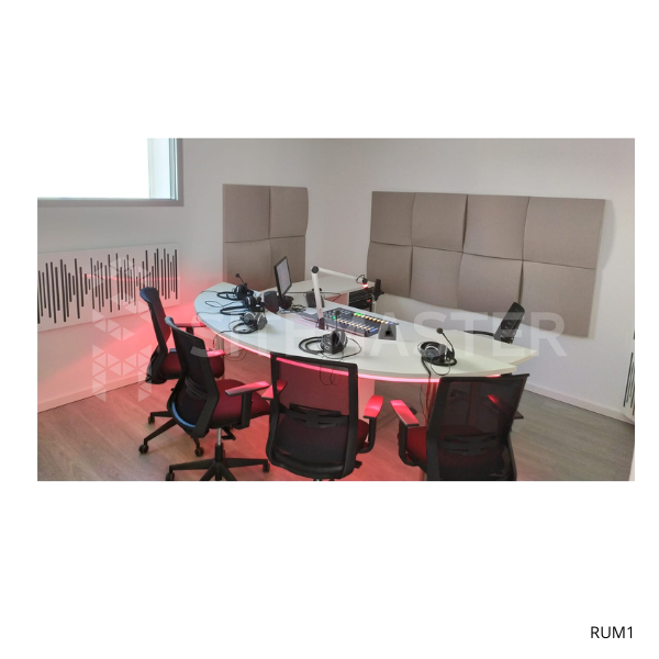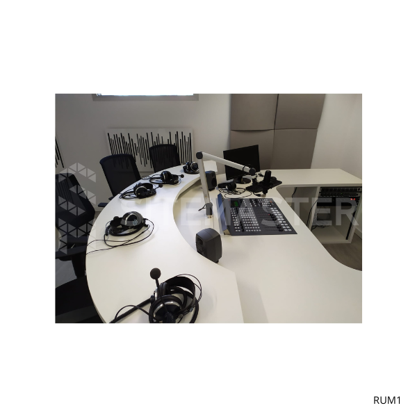 Mobiliário personalizado para 4 convidados. Linhas redondas e dois níveis de tampo distintos para locutor e convidados. Luzes led com comando. Inclui rack para equipamentos.